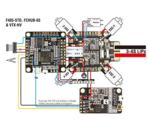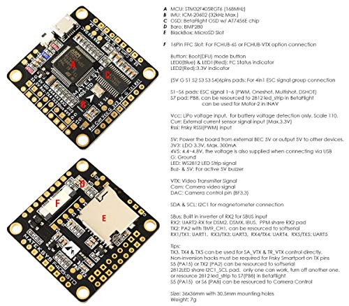 MCU: STM32F405RGT6(168mhZ). IMU: 6 assi 32K ICM20602 accelerometro/girobussola (SPI). OSD: OSD BetaFlight w / chip di AT7456E