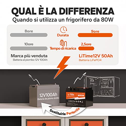 LiTime Batteria Litio 12V 50Ah, Batteria al Litio 12V Con Più Di 4000+ Cicli, 10 Anni Di Vita Utile, Batteria Lifepo4 Ideale Per Barche, Trolling Motor, Campeggio