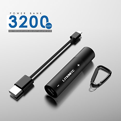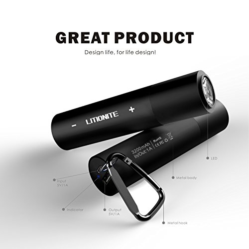 Litionite Blaze 3200mAh Mini Power Bank in Alluminio - 3 in 1 Caricabatterie USB/Torcia Led/Moschettone Portachiavi - Batteria Esterna d'emergenza Portatile Tascabile per Smartphone/Tablet (Black)