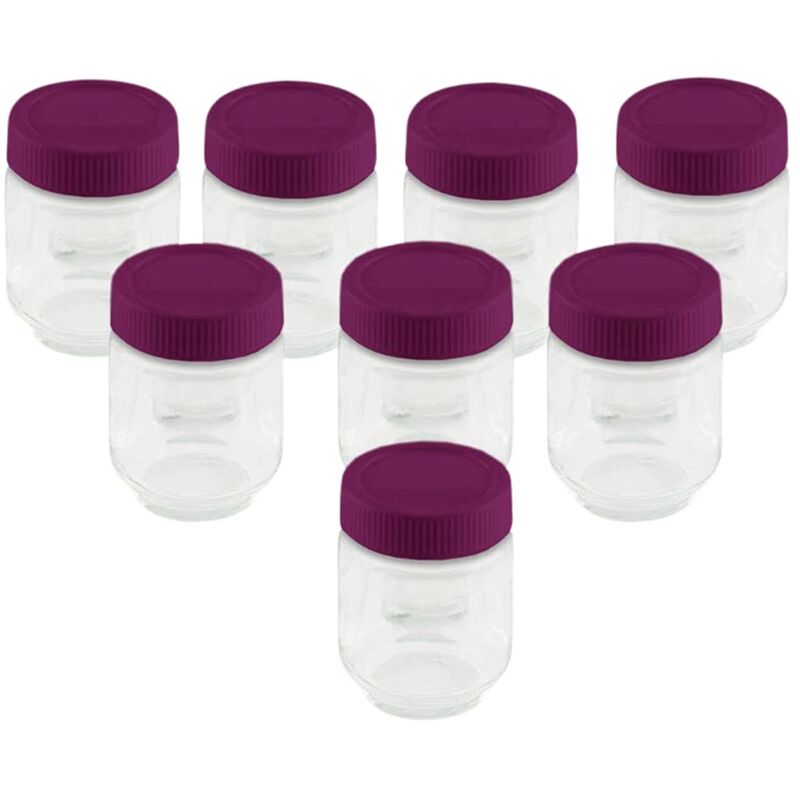 8 barattoli per yogurt complementari al tuo yogurt Little Balance, per variare yogurt e dessert Kit di 8 barattoli per yogurt in vetro - 190 ml Coperchio svitabile Coperchio colore prugna Si adatta alla maggior parte delle marche di yogurtiere, grazie al suo formato standard - Made in Italy