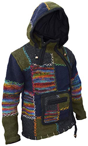 Little Kathmandu da uomo in lana foderato in pile lavorato a mano inverno giacca con cappuccio Patch Marsupio, Multicolore - Single Zip Kangaroo, Medium