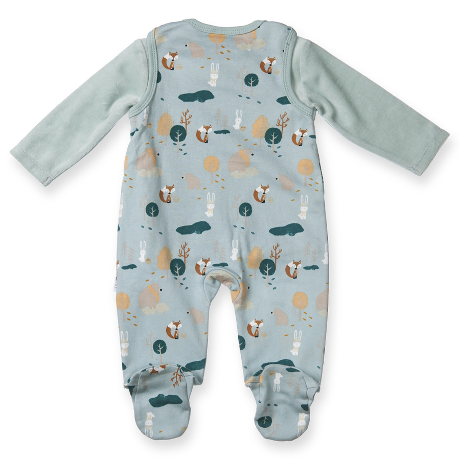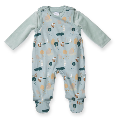 Simpatica tutina con simpatici motivi di animali della foresta. I bottoni sulla spalla della tutina la rendono facile da mettere e togliere. Abbinata alla tutina c'è la felpa abbinata. Dettagli del prodotto: 100% cotone Lavabile fino a 30 °C Non adatto all'asciugatrice Oeko-Tex Standard 100