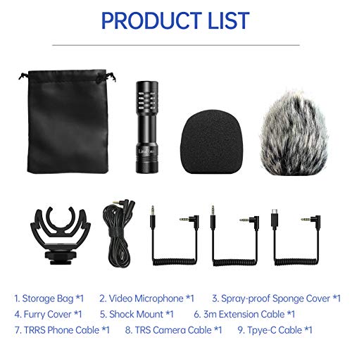 LituFoto - Microfono universale per fotocamera, con cavo di prolunga da 3 metri, ammortizzatore, TRS, TRRS e cavo audio di tipo C, per fotocamere DSLR Camcorder XiaoMi HUAWEI Samsung smartphone