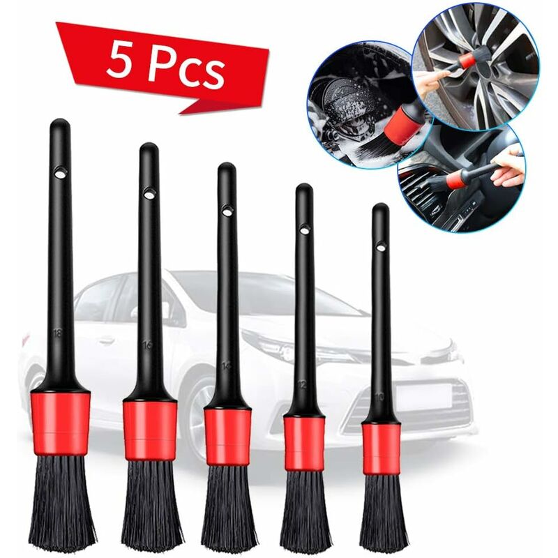 Set di spazzole per la pulizia automatica: 5 spazzole per la pulizia dell'auto di diverse dimensioni, puoi scegliere chiunque per soddisfare le tue esigenze, rimuovere polvere, briciole di pane e altri piccoli oggetti da ruote, prese d'aria, guarnizioni, pieghe. Morbida: la spazzola per auto in fibra sintetica è molto flessibile e non facile da perdere i capelli. Morbida e priva di parti metalliche con forza e flessibilità, che non graffierà o danneggerà il rivestimento del sedile in pelle. Facile da usare: grazie alla loro forma rotonda e alla superficie liscia, puoi usarli facilmente. Un unico foro sulla parte superiore del manico è comodo per appenderlo dopo l'uso. Ampiamente usato: questa spazzola per dettagli auto adatta a tutte le auto, suv, camion, furgoni, veicoli, motocicli, ampiamente utilizzata per la pulizia di interni, esterni, ruote, sedili del cruscotto, spazi vuoti, raggi, prese d'aria, cerchioni, ecc. Setole resistenti e di lunga durata: la spazzola per dettagli può