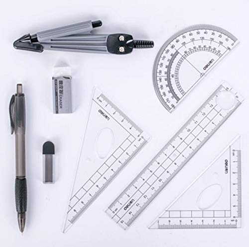 【Set bussola geometria】 - Include tutti gli strumenti matematici per la geometria: bussole geometriche, matita per bussola, piccola scatola di ricarica, goniometro, quadratini, gomma, righelli e penne gel.