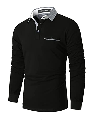 LIUPMWE Polo Uomo Manica Lunga in Cotone Basic Golf T-Shirt Clasic Plaid Cuciture Inverno,Nero-a,XXL