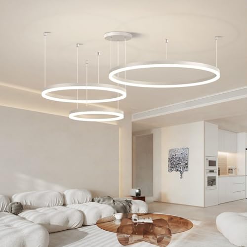 ▶ Lampadario Dimensioni, 3 diametro dell'anello ∅ 40+60+80cm, altezza 150cm. Potenza: 106W, flusso luminoso: 10850 lumen. Tensione: 220-240 V, L'area applicabile è di 20-35 m². durata fino a 50.000 ore.