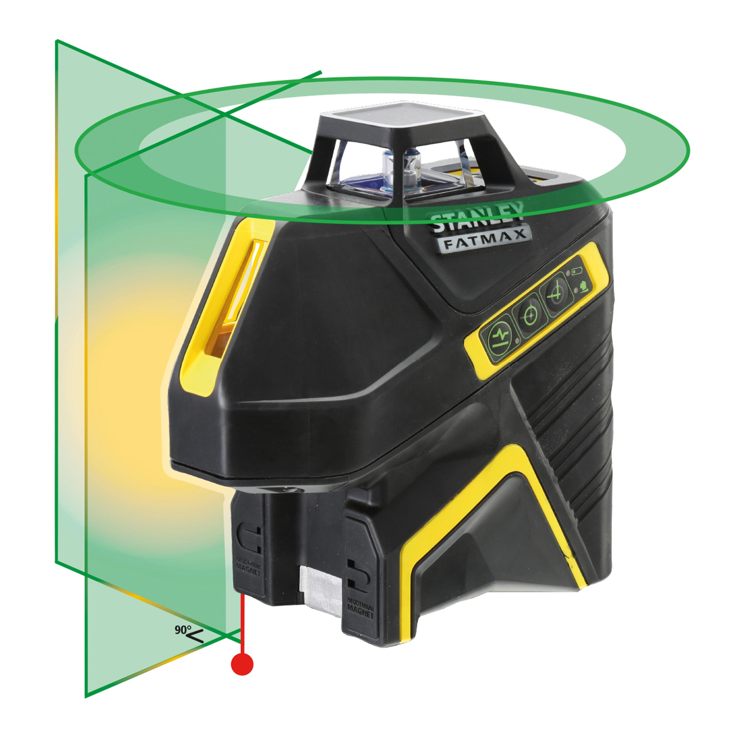 Livella laser a 360° + 2 linee verticali a 90° FATMAX SLGi-2V raggio verde. Traccia una linea completa a 360° + 2 linee verticali con un angolo di 120° + 1 punto a piombo.. La confezione include: target, occhiali, supporto magnetico regolabile FATMAX, carica batterie, valigetta PRO-STACK.. Portata 30m / 50m con ricevitore. Precisione 3mm a 10m. Campo di autolivellamento 4°. Tempo di autolivellamento 5 secondi. Cassa robusta completamente rivestita in gomma. Protezione a pioggia e polvere IP54. Funzione blocco del pendolo per trasporto in sicurezza. Utilizza batterie ricaricabili al Litio.. Proietta un raggio verticale molto nitido per allineamenti e messa a piombo. Magnete frontale che permette il montaggio diretto su binari in metallo. Luce pulsante per uso con ricevitore.