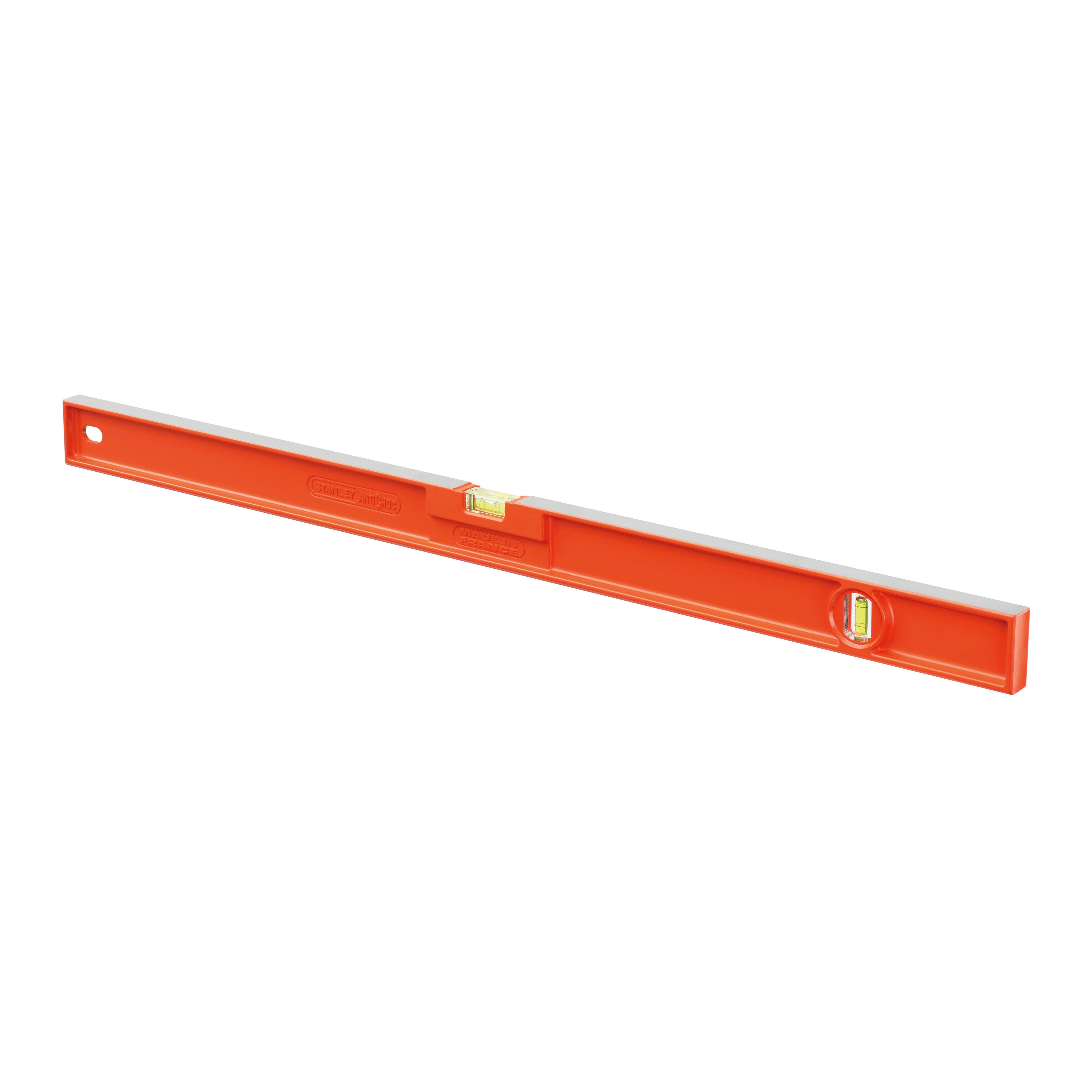 Livella manuale a bolla rettangolare, in alluminio, lunghezza 40 cm, 2 fiale. Corpo in lega d'alluminio. Basi ed estremità laterali rettificate. 2 bolle antichoc
