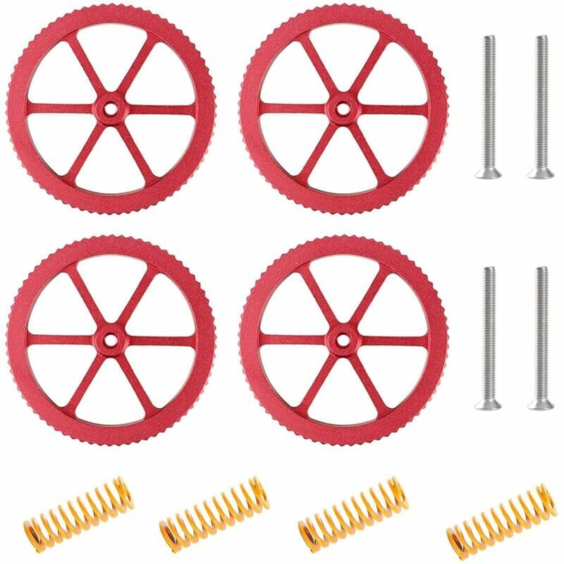 Pacchetto - Il pacchetto include 4 molle (4 * 20 mm), 4 dadi di aggiornamento a rotazione manuale in alluminio (59 mm), 4 viti (M4 * 34 mm) in quantità sufficiente per soddisfare le tue esigenze quotidiane. 【Compatibilità】 Dadi e molle di livellamento in alluminio aggiornati originali per le serie Ender e CR. 【Durevole】 I dadi di livellamento in alluminio hanno una durata maggiore rispetto alle materie plastiche. 【Vantaggi: i dadi di livellamento a rotazione manuale in alluminio rendono il letto caldo più stabile e la piattaforma di stampa è più facile da livellare. 【Nota calda】 Non esitate a contattarci per il rimborso o la sostituzione in caso di problemi, Grazie per aver scelto le nostre parti per aver scelto le nostre parti Stampante 3D, buona giornata. Descrizione del prodotto Metodo di installazione: 1. Inserisci le viti M4*34mm nei quattro fori angolari del piano riscaldato e installa le molle contemporaneamente 2. Avvitare il dado e regolare ad un'altezza adeguata 100% nuovo