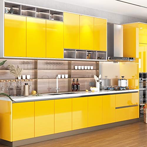 Materiale: Rotolo 40x200cm pellicola adesiva gialla lucida. Realizzato in plastica PVC, impermeabile, a prova di olio, lavabile, decorativi, carta da parati autoadesiva. Facilmente rimovibile.