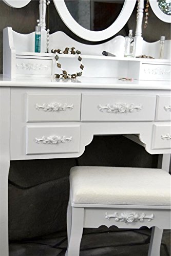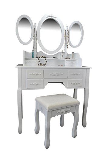 Dimensioni: ca. Altezza totale con specchio ca. 136 cm, dimensioni tavolo: altezza 70 x larghezza 50 x profondità 30 cm, dimensioni sgabello: 36 x 28 x altezza 44 cm, dimensioni specchio ca. 45 x 25 cm, altezza fino al bordo inferiore del tavolo: ca. 55 cm