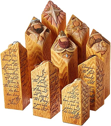 Nove meravigliosamente realizzati a mano, pilastri in legno rappresentano le figure classiche della natività. È una meravigliosa aggiunta a qualsiasi collezione di presepi. Una nuova interpretazione della classica decorazione natalizia con splendida e evidente sulla tua casa.