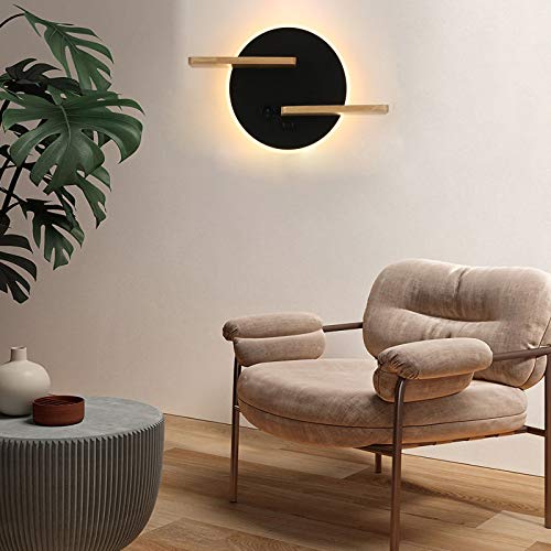 LMAMZ Applique da Parete Interno LED, Lampada da Parete Metallo Camera da Letto Moderno con Porta USB e Legno Mensola Luce a Muro Decorazione Soggiorno Creativo 9W Nero