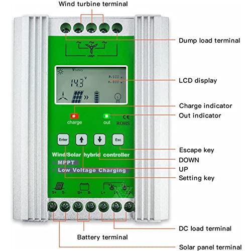 ♐♐ 【Regolatore di carica MPPT 60A】 Sezione di ricarica della ventola con tecnologia MPPT per una ricarica continua ed efficiente anche a basse velocità del vento. Funzione di scarico continuo, incluso resistore di carico di scarico esterno. Pannello solare di ricarica con tecnologia PWM, collegato in serie tramite tubi MOS.
