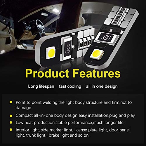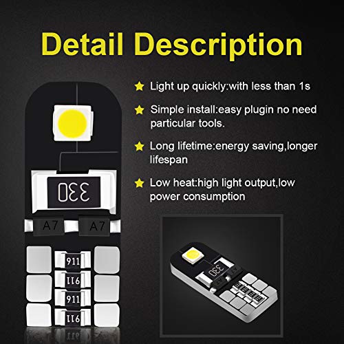 1.Super Bright: il LED W5W Ogni lampadina ha 2 2835 SMD su di esso, 6000K luce allo xeno bianca, angolo di illuminazione a 330 gradi, nessun punto cieco.