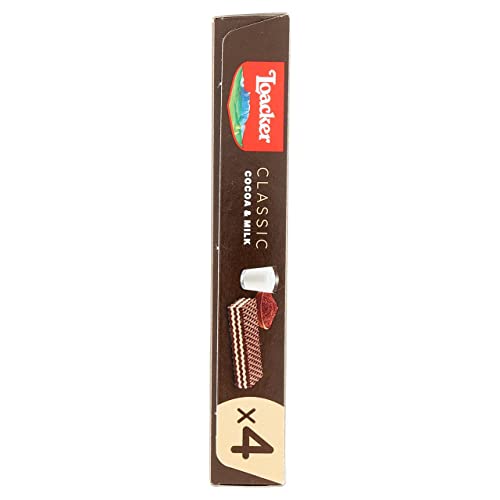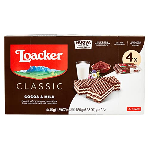Loacker, Classic Cocoa & Milk Multipack, Wafer Classico con 3 Strati di Cialde al Cacao Farcite con Crema al Latte Alpino, Merenda e Snack, Formato Convenienza, 1 Confezione da 4 Wafer da 45g
