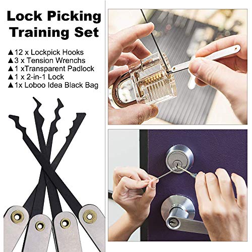 Loboo Idea Set di 17 plettri per lucchetti, kit di strumenti per la raccolta lucchetto, con 2 serrature trasparenti per principianti e fabbri professionali (set di 17 pezzi, trasparente)