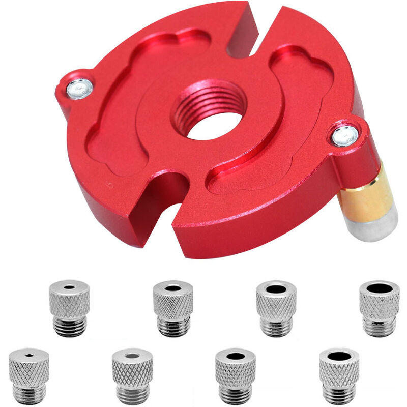 Localizzatore di punzoni autocentranti per la lavorazione del legno con 8 diverse dimensioni di boccole per trapano in metallo, pratico e ampiamente applicabile. Qualità affidabile e facile da usare, è un ottimo strumento per la lavorazione del legno sia per i principianti che per i professionisti. Caratteristiche: Il localizzatore di perforazione è realizzato in lega di alluminio di alta qualità con superficie anodizzata, che ha una buona durata, resistente all'usura e non facile da arrugginire. Dotato di 8 diverse specifiche di boccole per trapano in metallo, dimensioni 3-10 mm, elevata durezza, non facili da indossare, pratiche e ampiamente applicabili. La posizione dei piedi può essere regolata in base allo spessore della tavola, trova rapidamente la posizione centrale, punzonatura precisa ed efficiente, punzonatura dello spessore della tavola di legno fino a 45 mm. Con slot per tasselli da 6 mm e 8 mm e slot di allineamento della linea parallela, può aiutarti a completare