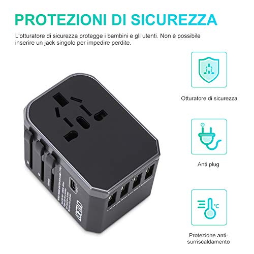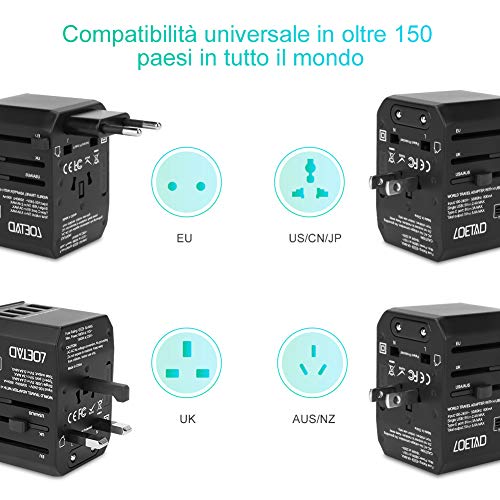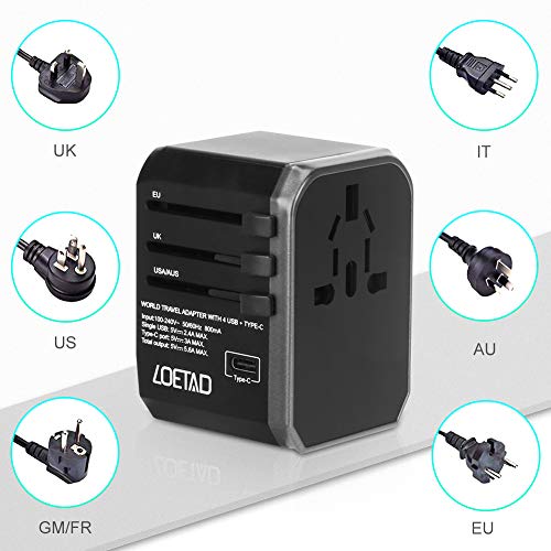 LOETAD Adattatore Universale da Viaggio con 4 Porte USB 3.0 e 1 Interfaccia Type-C 2000 W per Negli Stati Uniti, Regno Unito, Europa, Asia, ecc.