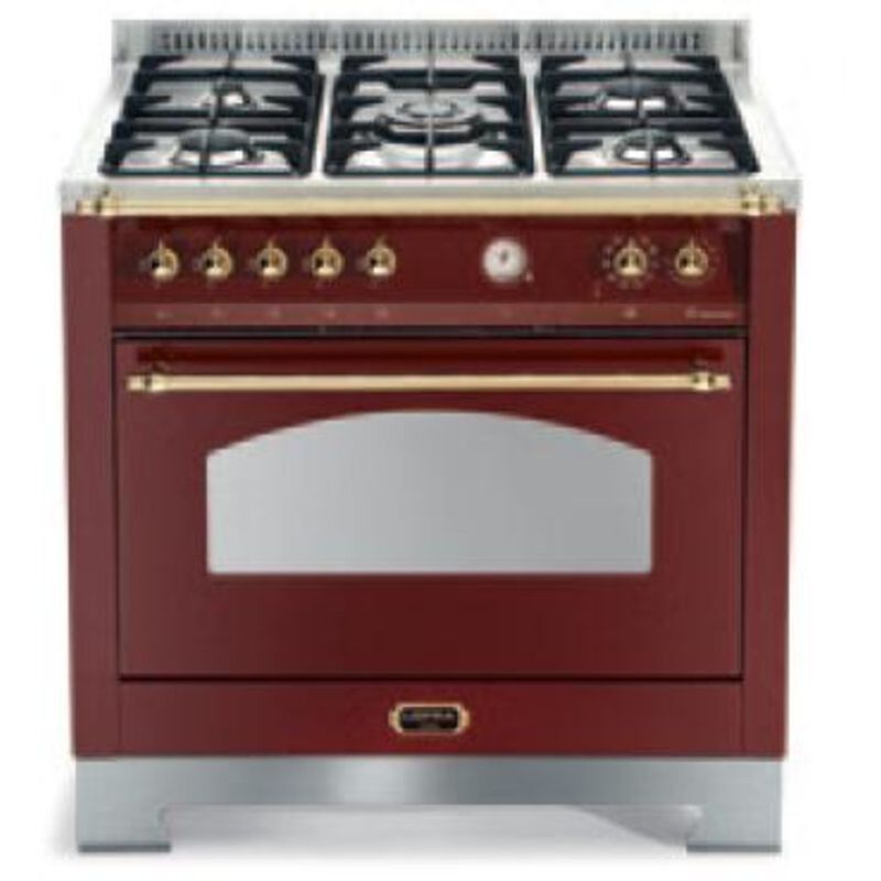 Piano cottura - finitura acciaio inox satinato - 5 fuochi a gas valvolati III Serie di cui 1 tripla corona - accensione elettronica integrata alla manopola - protezione totale Gas-Stop - griglie in ghisa Forno - multifunzione elettrico a 9 programmi - capacità 94 lt - grill elettrico - orologio di inizio e fine cottura - porta con 3 vetri di cui 2 riflettenti per una minore dispersione di calore - vetri interni della porta asportabili per facilitarne la pulizia - guide forno estraibili - ventola tangenziale per raffreddamento cruscotto - smaltatura forno easy to clean - piedini regolabili in altezza e in profondità e zoccolo di serie - con zoccolo montato altezza 90 cm Lofra RRG96MFT/CI. Tipo di prodotto: Piano cottura, Colore del prodotto: Bordeaux, Acciaio inossidabile, Tipo di controllo: Manopola. Tipo di piano cottura: Gas, Numero totale elementi piano cottura: 5 Fornello(i), Numero di fornelli: 5 Fornello(i). Dimensione del forno: Largo, Sorgente di alimentazione del forno