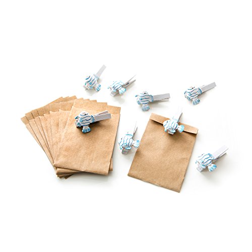 Logbuch-Verlag 8 mini bustine sacchetti carta kraft marrone + 8 piccole mollettine decorative pesce blu bianco regalo bomboniera bambini confezione