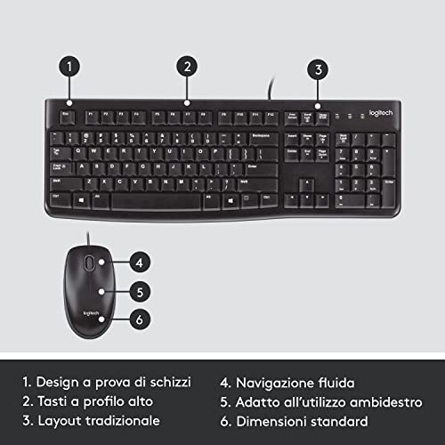 Logitech MK120 Combo Tastiera e Mouse con Filo per Windows, Mouse Ottico Cablato, Tastiera di Dimensioni Standard, USB Plug-and-Play, Compatibile con PC, Laptop, Layout Italiano QWERTY - Nero