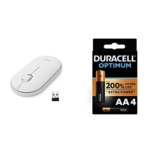 Logitech Pebble Mouse Wireless, Bluetooth o 2.4 GHz, Ricevitore USB, Silenzioso, PC/Mac/Laptop/iPadOS/Chromebook, Bianco + Duracell NUOVO Optimum AA, Batterie Stilo Alcaline, Confezione da 4, 1.5 V