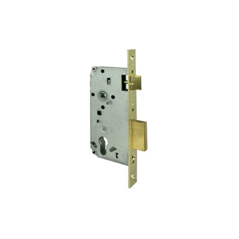 Per cilindro sagomato. Scrocco reversibile. Chiusura con catenaccio a 2 mandate. Quadro maniglia Mm. 8. Frontale con bordo quadro da Mm. 22x240. Altezza scatola Mm. 170. In dotazione: 1 contropiastra e viti di fissaggio.