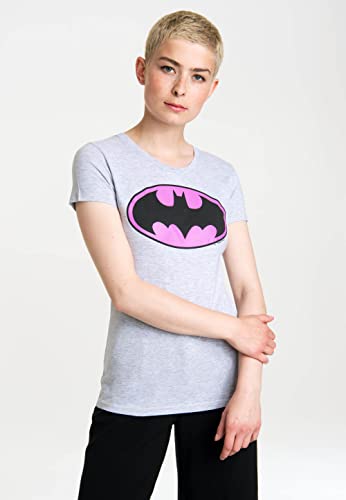 LOGOSHIRT T-Shirt Donna Batman Logo Rosa - DC Comics - Il Supereroe - nel Colore - Grigio Melange - Design Originale Concesso su Licenza, Taglia XS