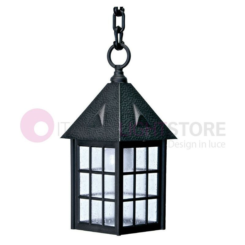 Apparecchio di illuminazione per esterni realizzato in resina Duralighting, colore nero, applicazione a soffitto. Lanterna a sospensione per esterni in materiale DURALIGHTING, ideale per illuminare spazi aperti, giardino, balcone, portico e cortile. Dimensioni: altezza massima 70 cm.(regolabile);
