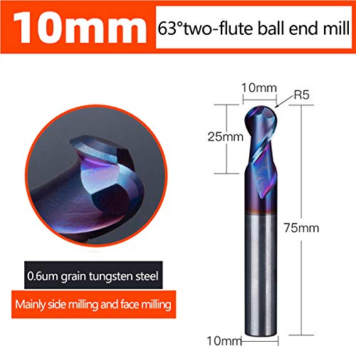 LOKIH Fresa A Testa Sferica 2 Taglienti Fresa in Metallo Duro CNC Frese A Codolo Cilindrico Punte per Acciaio Inossidabile, Ghisa, Rame Full Length: 75Mm,Diameter:10mm/R5.0
