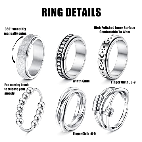 LOLIAS 6PCS Anello Ansia per Donna Uomo Spinner Ring con Perline Anelli a Fascia Moon Star Cool Fidget Ansia Ring Bead Ring per Ansia Stress Ring Anti Ansia Relief Rings