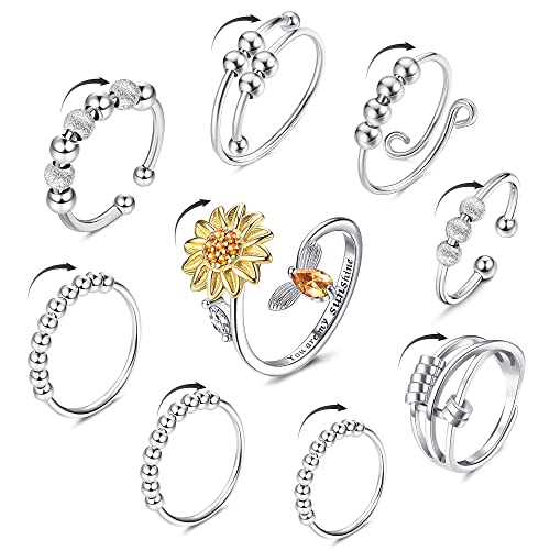LOLIAS 9 Pezzi Anelli Spinner per Ansia Donna Anello Perline Girasole Fidget Anello Set Aperto Regolabile Bead Anelli Meditazione Antistress
