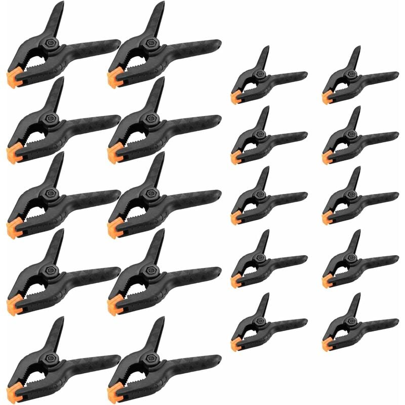 Vantaggi: - Le nostre pinze a morsetto sono realizzate in nylon di alta qualità, elevata durezza, durevole per un uso prolungato. - I denti all'interno della clip possono aumentare la forza di serraggio e la forza di attrito, più stabile. - Il mandrino regolabile arancione può cambiare l'angolo in base all'oggetto, proteggendo efficacemente la superficie dell'oggetto di lavoro da eventuali danni. - Il motivo sull'impugnatura fa sentire la mano a proprio agio quando impugnata saldamente. - Questi morsetti in legno sono lo strumento perfetto per riporre teloni, fotografie, mussola, fondali, schermi, riflettori, lavorazione del legno, foto e altro ancora. Specifiche - Nome prodotto: Clip a molla < br/> - Colore: nero - Materiale: nylon + plastica - Dimensioni: come mostrato nelle immagini La confezione include: 10 clip a molla (2 pollici ) 10 clip a molla (3 pollici) Suggerimenti - Si prega di consentire la piccola deviazione di misurazione dovuta alla misurazione manuale.
