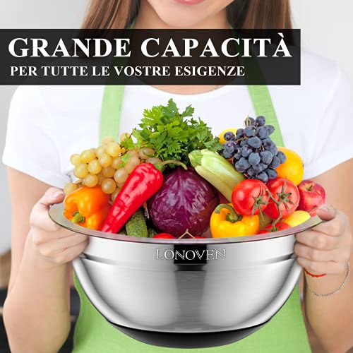 LONOVEN Ciotola in Acciaio Inox Set di 5,Ciotola di Miscelazione in Acciaio Inossidabile con Coperchio e Misure Graduate,Ciotole in Acciaio Cucina con Basi in Silicone Antiscivolo