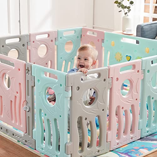LONTEK Box per Bambini Pieghevole con Sicurezza, Recinto Bambini con Porta e Palline per Bambini da 0 a 6 Anni, Interno ed Esterno, con 14 Pannelli (Onda 12 + 2)