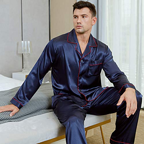 Lonxu Pigiama Set pigiama da uomo in raso di seta a maniche lunghe Loungewear in due pezzi pigiameria abbottonata Pj Set S-XXXXL, Colore: blu navy., XX-Large