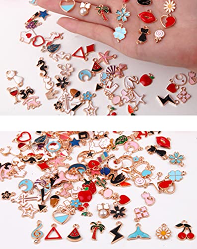 【La confezione include】Un totale di 100 pezzi di ciondoli in smalto colorato in diversi stili. tra cui corona, stella marina, gatto, fiore, unicorno, stella, luna, coniglio, caramelle, fragola, banana, anguria e altro ancora, una quantità sufficiente può soddisfare le tue varie esigenze fai-da-te.
