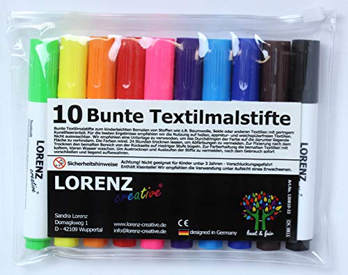 LORENZ Creative 10 matite in Tessuto, Impermeabili, maneggevoli, in Pizzo, perfette per progetti Fai da Te Colorati e per dipingere Borse di Stoffa, Sacchetti di Iuta, Magliette e Altri Tessuti.