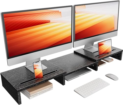 【Slot Multifunzione Extra】Il design unico degli slot può ospitare cellulare, tablet, penne, clip e altre scorte da ufficio. Soprintendente, include un hub di gestione cavi. Non dovrai più preoccuparti di fare confusione con i cavi. Il nostro stand da monitor doppio porta una vita più comoda in casa e in ufficio.