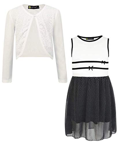 LOTMART Ragazze Chiffon a Pois Vestito Gonna Bundle con Manica Lunga Aperto Bolero - White-Cream, 13-14 Anni