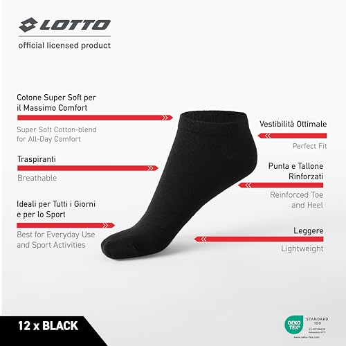 Lotto 12 Paia Calzini Uomo, Traspiranti e Leggeri, Pariscarpa in Morbido Cotone, Ideali per Running, Palestra, Fitness, Pilates, Certificati OEKO-TEX, Nero, 39-42