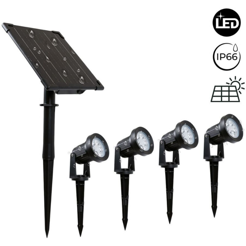 Kit di 4 faretti solari da esterno con pannello solare. Ogni faretto è dotato di un picchetto per una facile e solida installazione nel terreno, nel prato o in un vaso di fiori. Il pannello solare è collegato a ogni faretto con un cavo lungo 280 cm (4 cavi in totale, uno per ogni faretto). La batteria si ricarica automaticamente durante il giorno e ha un'autonomia fino a 12 ore. Di notte le luci si accendono automaticamente. Incorporando l'energia solare, questi apparecchi sono ecologici, rispettosi dell'ambiente, a bassa tensione e sicuri. Disponibile in bianco caldo (3000K).