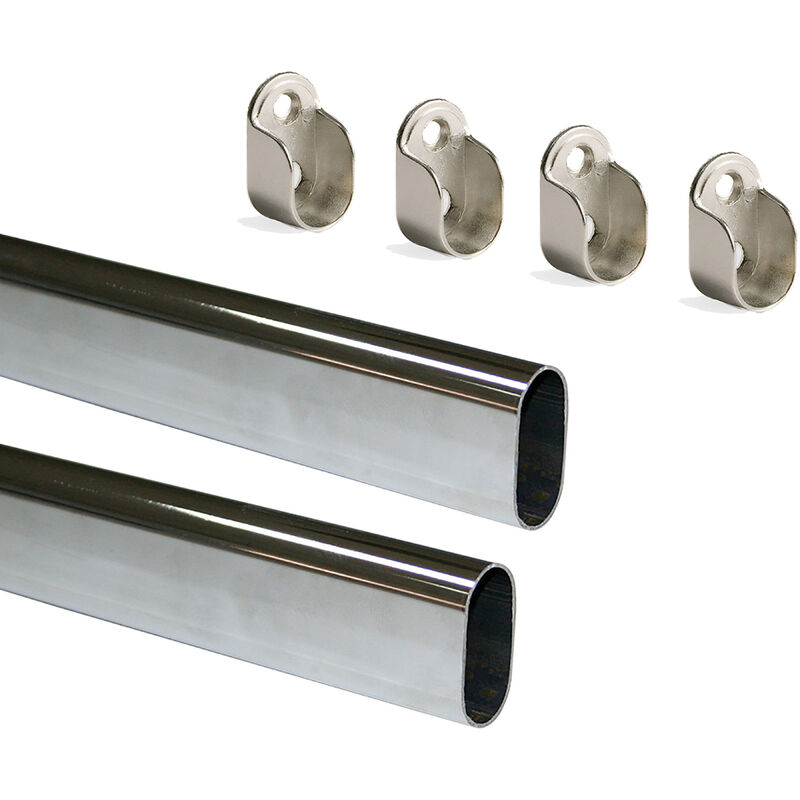 Kit include due tubi per armadio 30x15 mm prodotti in acciaio e i supporti laterali per l'installazione. In conformità alla norma ISO: 7170:205, la barra ed i reggitubi possono sostenere un peso massimo di 40 kg/metro uniformemente divisi. Lunghezza dei tubi: 950 mm. Ogni kit include due tubi per armadio 30x15mm e reggitubi laterali per l'installazione. Tubo prodotto in acciaio con finitura cromata e supporti in zama nichelata 2 tubi da 950 mm, 4 supporti laterali