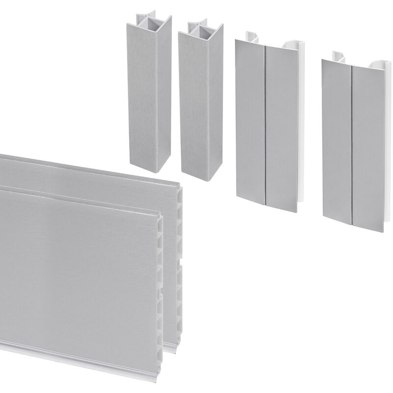 Kit battiscopa da cucina composto da 2 zoccolini e accesori per unione per offrire una soluzione pratica ed estetica alla tua cucina. Protegge gli armadi da cucina inferiori da danni e dalla penetrazione di liquidi e polvere nello spazio tra gli armadi e il pavimento. I battiscopa sono forniti a 2,35 metri di lunghezza e con un giunto integrato e sono resistenti all'umidità, agli agenti chimici e ai raggi UV. Gli accesori per unione sono costituiti da 2 raccordi per formare angoli di 90° e 2 raccordi flessibili per una maggiore versatilità e per poter adattare i battiscopa a qualsiasi angolo. Sia il zoccolo che gli accessori sono forniti a due altezze (100 mm e 150 mm), sono realizzati in pvc con finitura anodizzata satinata e forniti con pellicola protettiva in plastica. Si compone di 2 barre di zoccolino a 2,35 m. Include 2 accesori per angoli 90° e 2 accessori flessibili. Altezza 100 mm. Sono forniti con film plastico protettivo. Plastica con finitura anodizzata satinata. 2 barre
