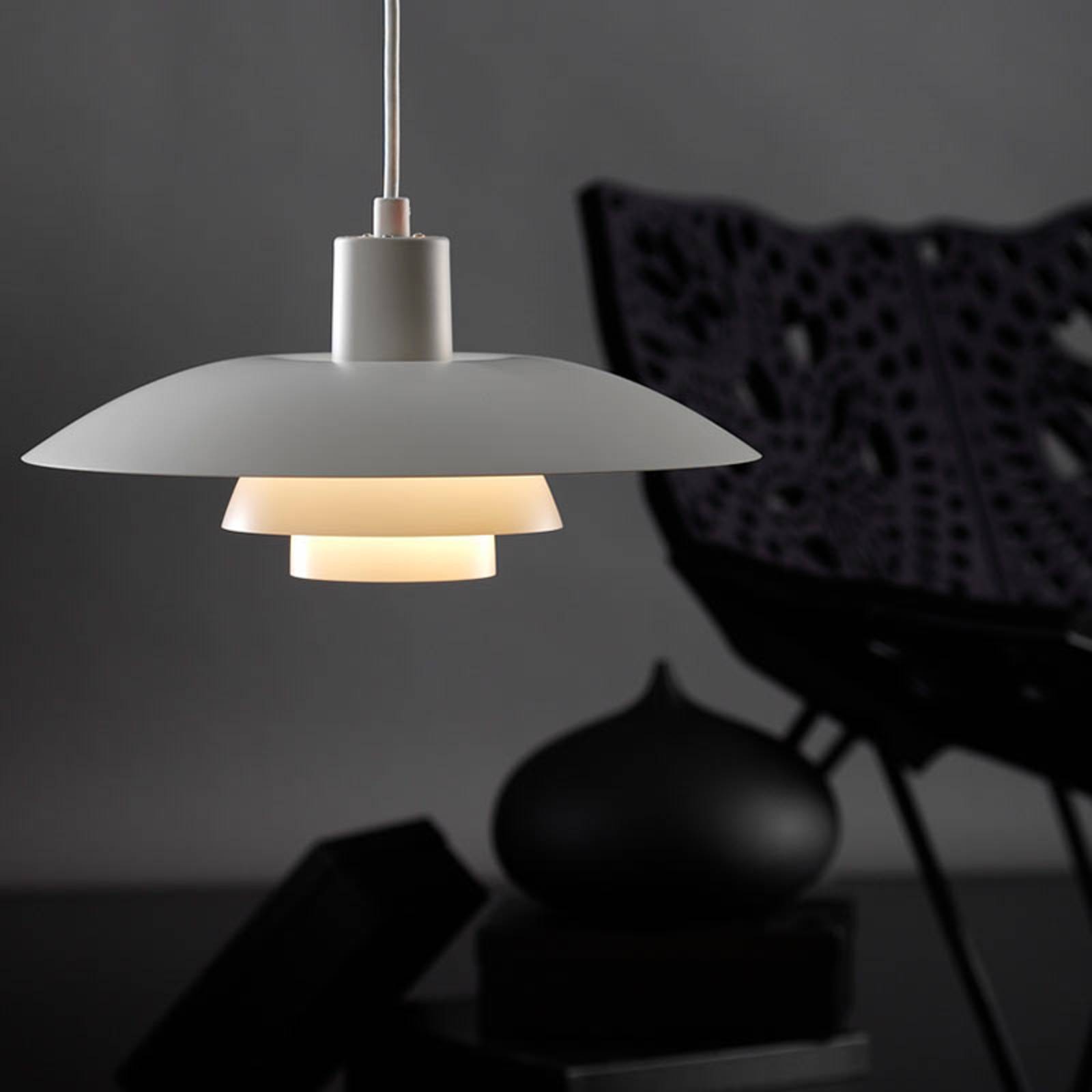 Lampada a sospensione di design PH 4/3 - diametro da 40 cm Con i suoi tre paralumi, la lampada a sospensione PH 4/3 è un elemento d'arredo decorativo che si mostra in tutto il suo splendore non appena si accende la luce. Il design è così attuale che non sembra risalire al lontano 1925/26, quando Poul Henningsen, noto designer danese, progettò questa lampada con l'obiettivo di creare una fonte di luce priva di effetti abbaglianti. Proprio come allora, anche oggi il paralume della lampada a sospensione PH 4/3 è realizzato in metallo, nel caso specifico alluminio trafilato, verniciato di bianco. La luce, quasi interamente convogliata verso il basso, è perfetta per illuminare, ad esempio, un tavolo da pranzo. Fedele al principio delle tre F di "Form folgt Funktion" (la forma segue la funzione), il produttore di lampade Louis Poulsen realizza lampade la cui forma non sia solo fine a se stessa, ma piuttosto sia in grado di dare forma alla luce.