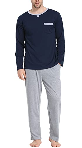 Lovasy Pigiama da Uomo Set Comodo Pigiami Due Pezzi in Cotone Invernale Maniche Lungo Pantaloni Completino Casual per Casa con Tasche S-XXL, Blu M