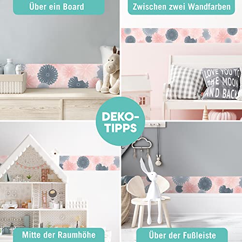 Lovely label Pompom - Rosette - albicocca/grigio - bordo autoadesivo 450 x 11,5 cm - tatuaggio murale - bordo per carta da parati