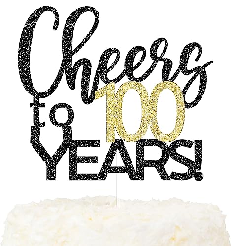 LOVENJOY Cheers to 100 Years Cake Topper for Happy 100th Birthday Anniversary Cake Decorations, Dual-Side Glitter Black and Gold